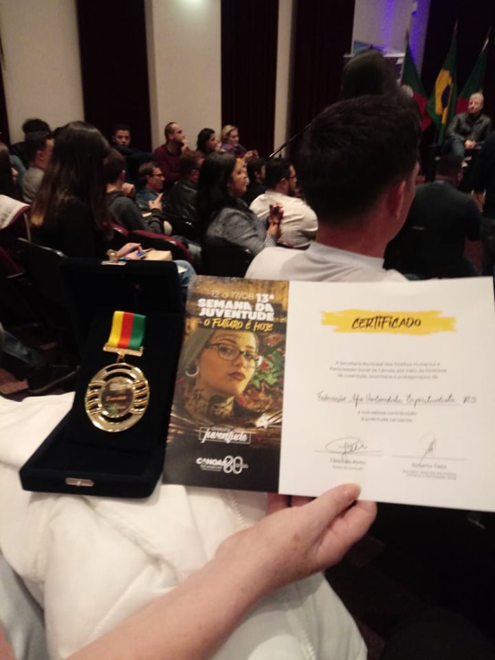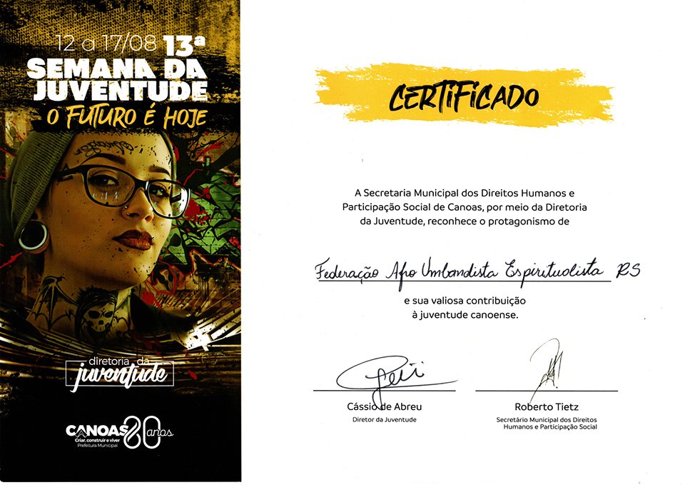 Hoje Tarde Especial para os Jovens da FAUERS, na semana da juventude a Prefeitura de Canoas na Pasta do Secretário Roberto Tietz abriu a semana da juventude de Canoas, os Jovens da FAUERS foram homenageados como protagonistas na construção de uma juventude AFRO UMBANDISTA mais unida, Agradecemos a indicação e a prefeitura pela iniciativa, a Diretoria de Diversidades na Pessoa Do diretor Saulo Da Silva Gil pela Indicação e todos religiosos por acreditarem na FAUERS.